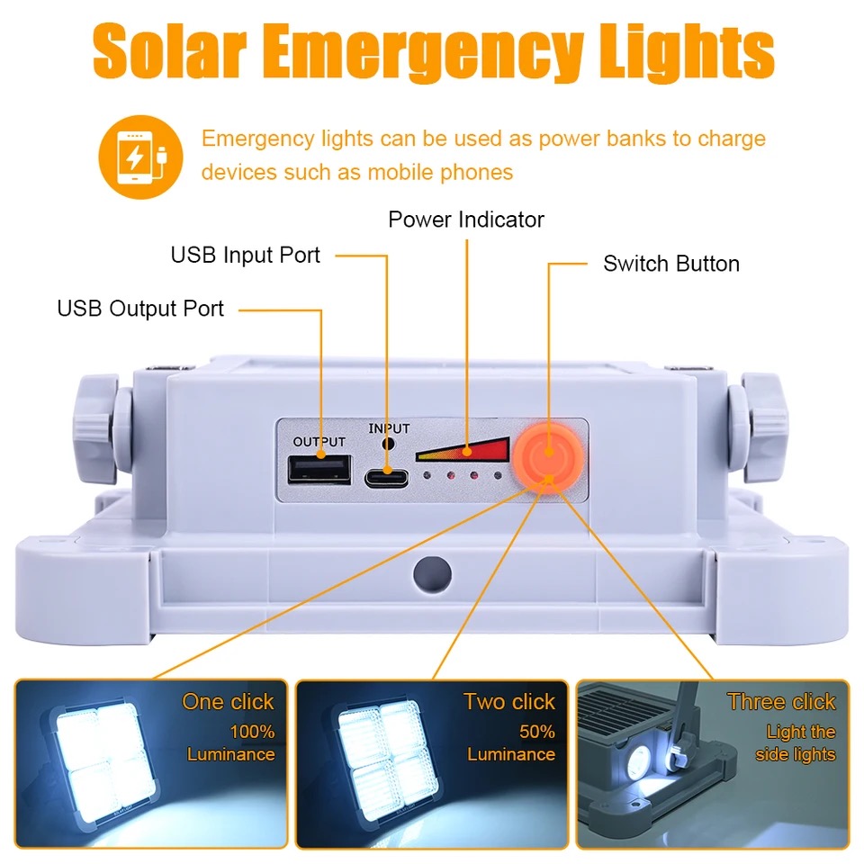 The 60W LED Work Light 2in1 is a powerful and versatile lighting solution, perfect for indoor and outdoor use. Equipped with dual charging options (Solar + USB), this handheld floodlight ensures you never run out of light during emergencies, outdoor adventures, or work projects.