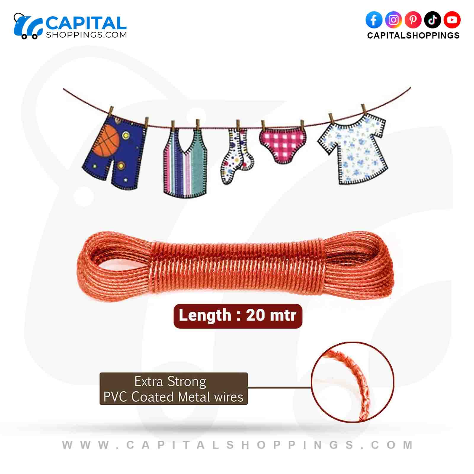 Keep your clothes organized and dry with this 20-metre PVC coated metal laundry rope. Strong, durable, and rust-resistant, it is designed for wet and heavy clothes. The PVC coating prevents damage to fabric while ensuring long-lasting use. Perfect for households, balconies, bathrooms, and outdoor drying, this portable clothesline is easy to install and convenient for everyday laundry needs.